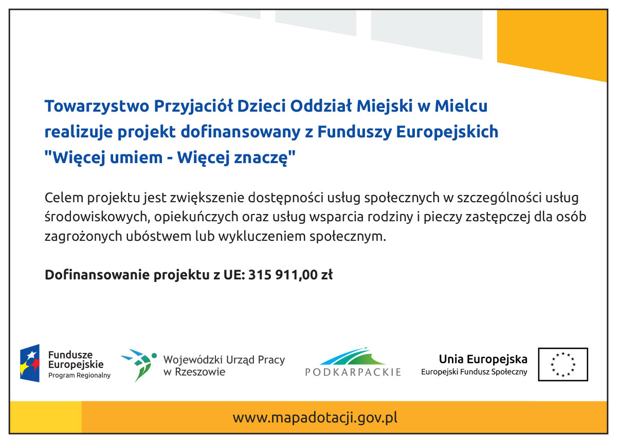 Towarzystwo Przyjaciół Dzieci Oddział Miejski w Mielcu realizuje projekt w ramach Regionalnego Programu Operacyjnego Województwa Podkarpackiego na lata 2014-2020.